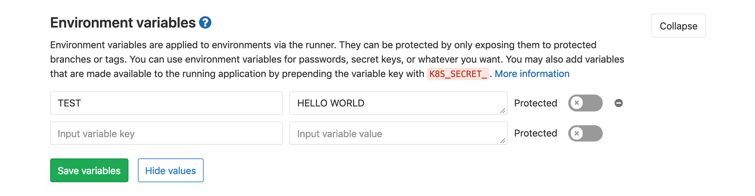 From the UI, navigate to your project's Settings > CI/CD and expand Environment variables. Create a new variable by naming it in the field Input variable key, and define its value in the Input variable value field: