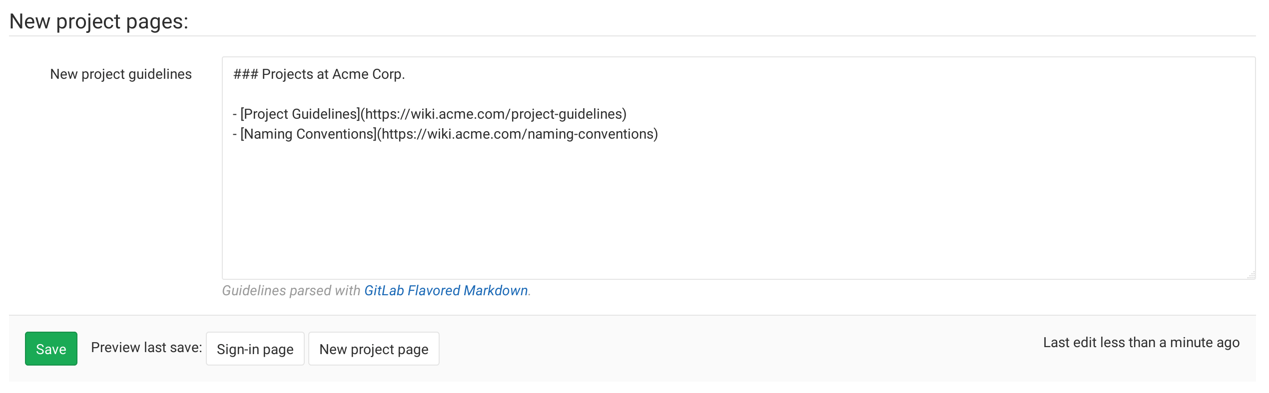 It is possible to add a markdown-formatted message to your GitLab new project page.