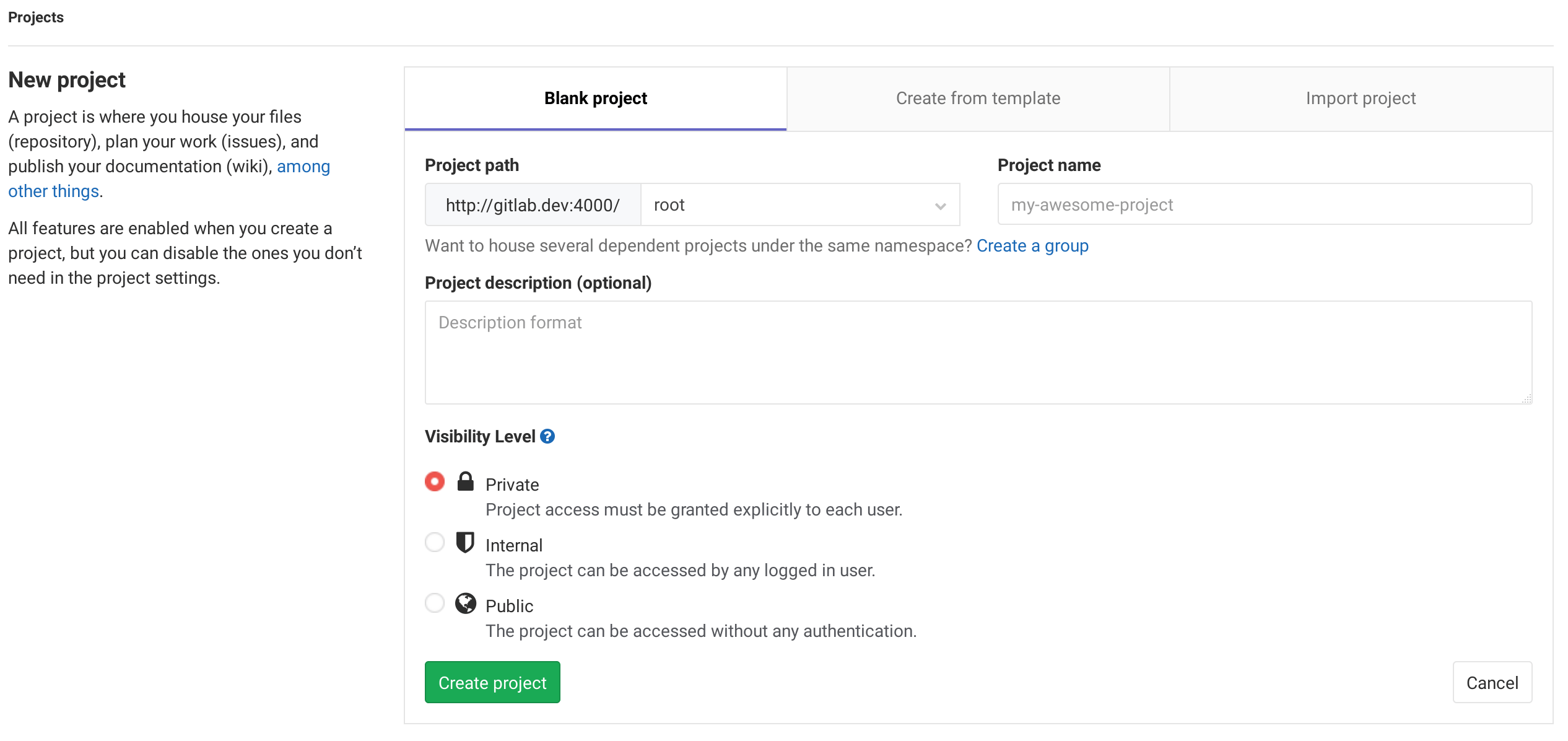 By default, the new project page shows a sidebar with general information: