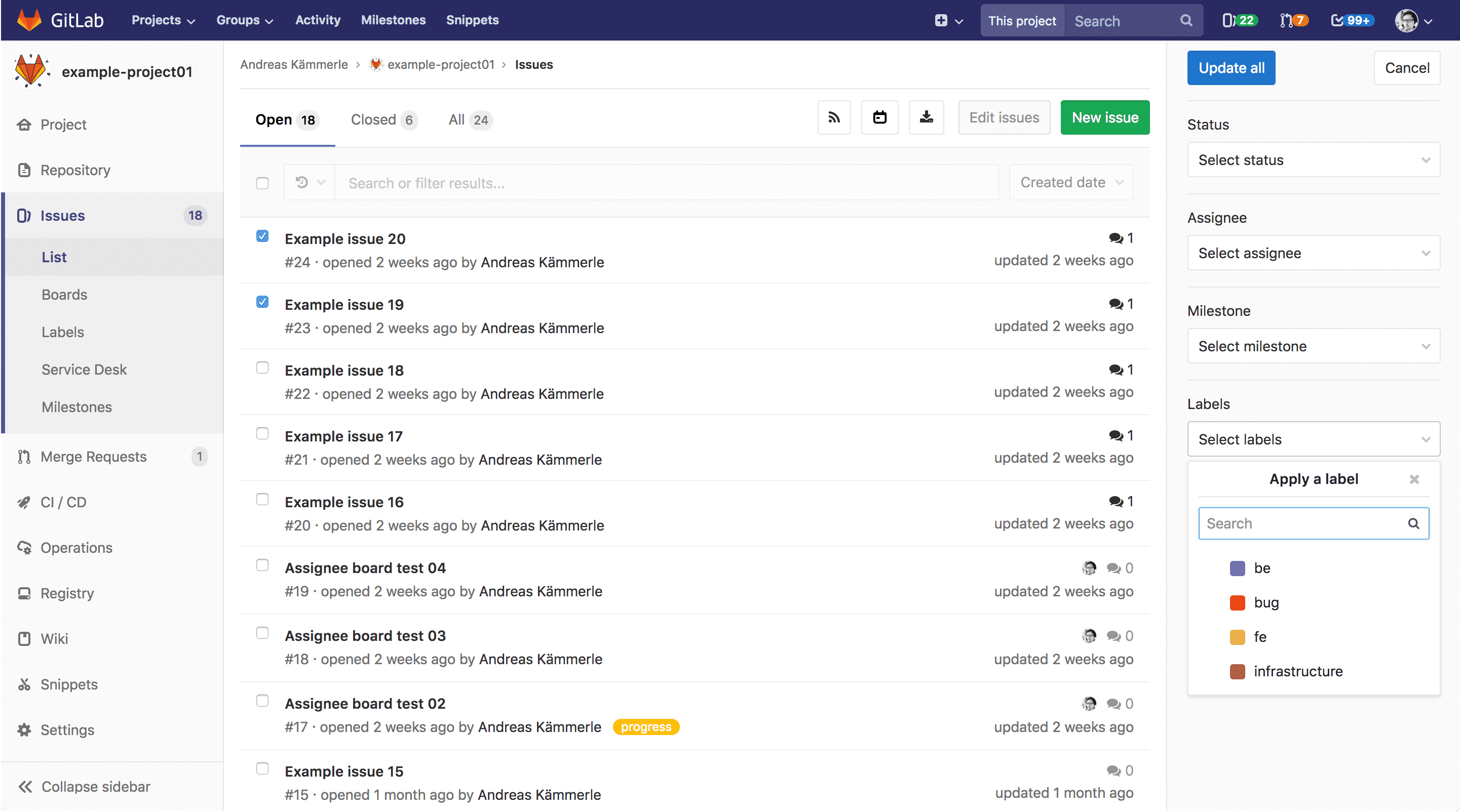 NOTE: Note: Bulk editing of issues and merge requests is only available at the project level.