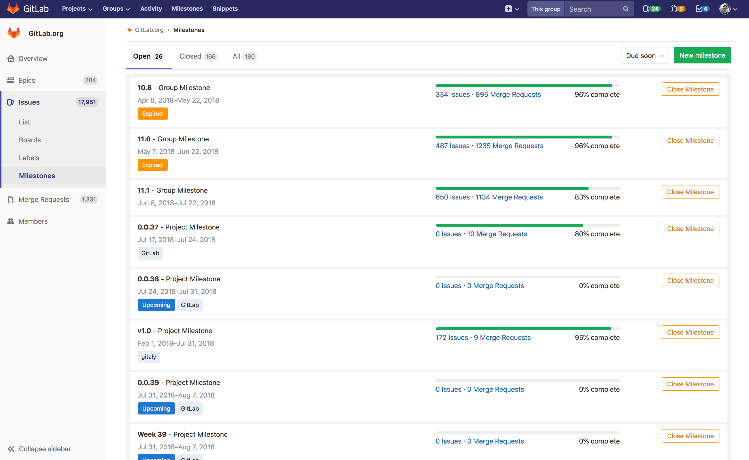 - Upcoming: Show issues or merge requests that have been assigned the open milestone that has the next upcoming due date (i.e. nearest due date in the future).